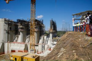 De manera simultánea, avanza la instalación de las compuertas radiales del vertedero, piezas clave para el manejo hidráulico de la obra, cada una con dimensiones de 12 metros de ancho por 14 metros de alto y un peso aproximado de 110 toneladas.